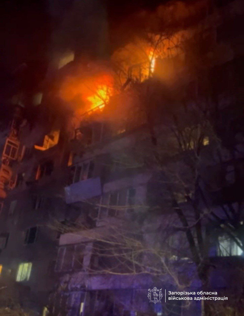 Ворог атакував Запоріжжя ударними "Шахедами", один з яких влучив у багатоповерхівку. В результаті сталась пожежа, вже відомо про двох постраждалих.