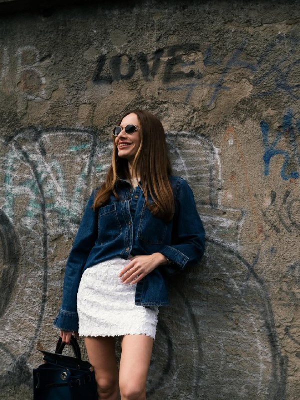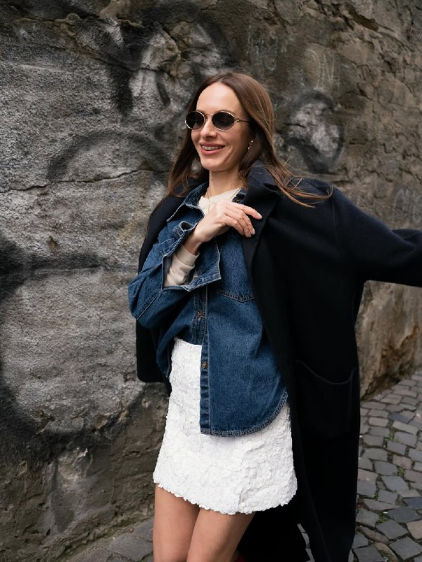 Низ - біла мініспідниця з об’ємним квітковим мереживом, що додає романтичності та легкості. Поєднання "денім + мереживо" вже кілька сезонів залишається класикою, яка завжди виглядає свіжо навесні.